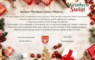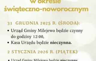 Informujemy, że w dniu 31 grudnia 2025 r. (środa)Urząd Gminy Milejewo będzie czynny do godziny 12:00. Informujemy, że w dniu 2 stycznia 2026 r. (piątek)Urząd Gminy Milejewo będzie nieczynny. W przypadku konieczności sporządzenia aktu zgonu [...]