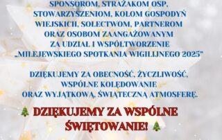 W dniu 14 grudnia 2025 r. odbyło się „Milejewskie Spotkanie Wigilijne”. Była to druga edycja tego typu bożonarodzeniowego wydarzenia kulturalnego, skierowanego do mieszkańców Gminy Milejewo, połączonego z prezentacją stoisk lokalnych stowarzyszeń, Kół Gospodyń Wiejskich oraz [...]